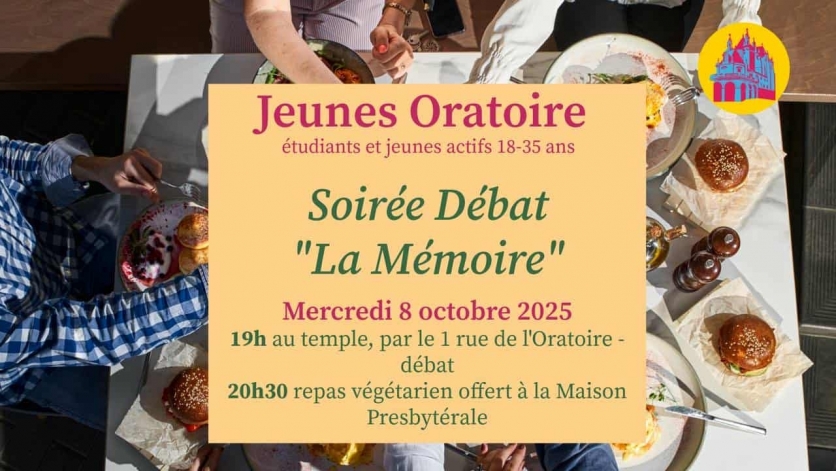 Mercredi 8/10, soirée-débat mensuelle des jeunes protestants à Paris — qui portera sur le thème de "la mémoire".